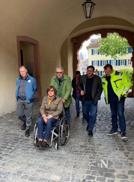 Die Initiative „Barrierefreies Bad Homburg“, vertreten durch Joachim Völkening (l.) sowie Hildergard Pagel und Dieter Pagel (2. v. l.) macht sich vom barrierefreien Zugang in den unteren Schlosshof ein Bild. Dabei sind auch Baudenkmalpfleger Nils Wetter (2. v. r.), Schwerbehindertenvertreter Rüdiger Schwachta und Oliver Baumann. Foto: Kiraly