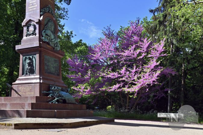 Bad Homburg (a.ber). Es gibt Szenarien, die uns innehalten lassen. Bilder, in denen sich etwas offenbart, das scheinbar besonders gut oder eben gar nicht zusammenpasst. Wie die Darstellung militärischer Ehren mit bronzener Standarte, Eichenlaub und Wappenschild und der Herrscher des hessen-homburgischen Landgrafenhauses auf dem Landgrafendenkmal am Ende der Brunnenallee im Kurpark und dem direkt daneben auch dieses Frühjahr wieder rosa aufblühenden fünfstämmigen Baum.