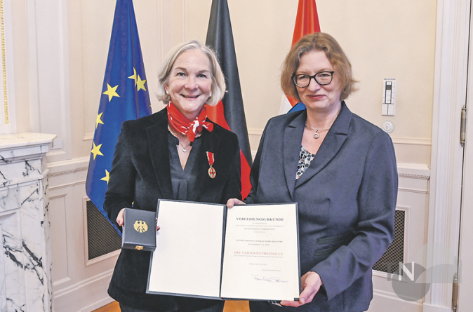Bad Homburg (hw). Staatssekretärin Katrin Hechler hat am vergangenen Dienstag stellvertretend für Bundespräsident Frank-Walter Steinmeiner den Verdienstorden am Bande an die Bad Homburgerin Viviane Freifrau von Kap-herr-Neigefink übergeben und damit das außerordentliche soziale Engagement der 61-Jährigen gewürdigt.