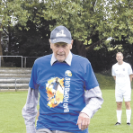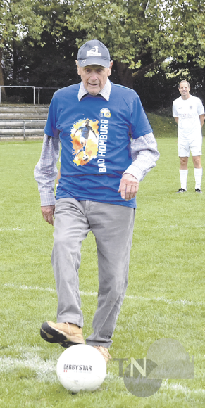 Auch mit 93 Jahren noch perfekt am Ball: Werner Remy, der den Anstoß zum Prominentenspiel ausgeführt hat.Foto: gw