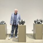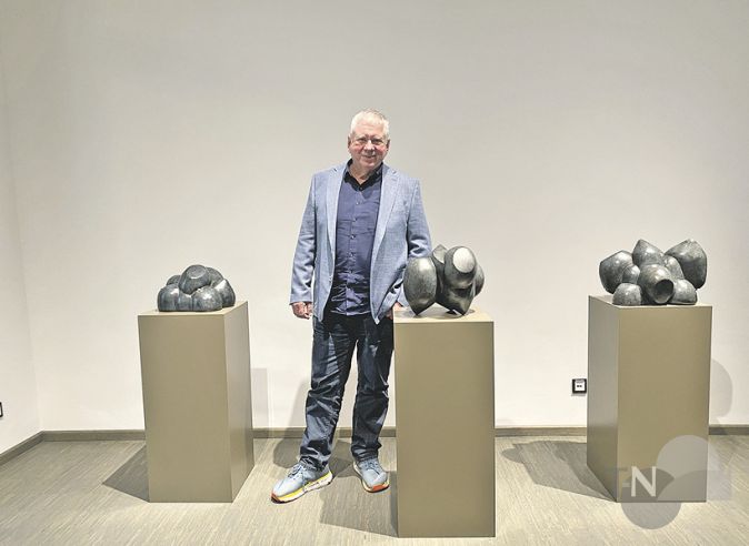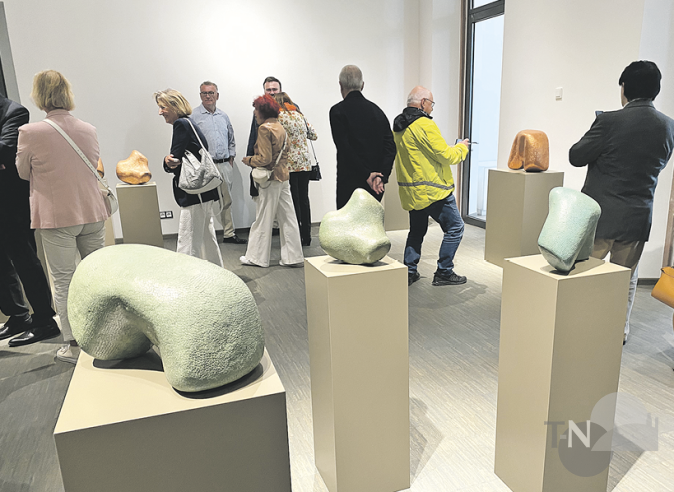 Die Bronzen aus der Serie „AL“ sind die neuesten Arbeiten von Rainer Hunold. Während der Ausstellungseröffnung plaudert er mit den Besuchern über seine Skulpturen. Foto: csc