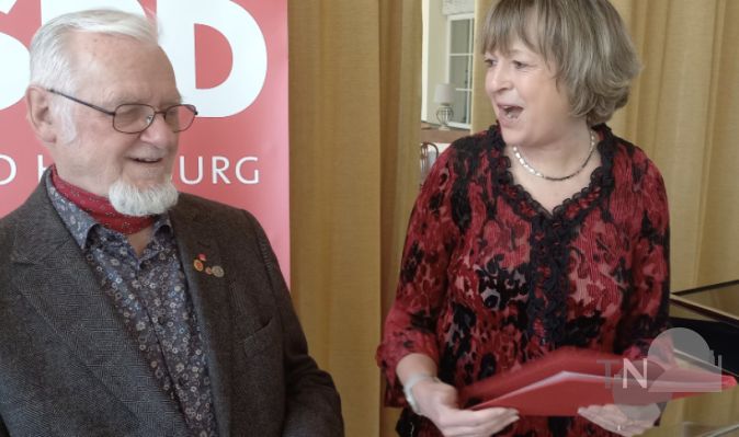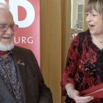 Noch einer, der immer und bei allem mit Herzblut dabei ist, ist Wolfgang Zimmermann, „waschechter Homburger“, der mit seinen nun 94 Jahren schon 73 Jahre SPD auf dem Buckel hat. 30 Jahre im Stadtparlament, Fraktionsvorsitzender, lange Awo-Vorsitzender und Vorsitzender des Sportausschusses. Und er war pädagogischer Leiter an der GaG, sieht sich selbst als Geschichtenerzähler, die Arbeit mit den Jugendlichen war dem Mahner in der historischen Betrachtung immer wichtig. Der SPD ist er treu geblieben, weil die Partei immer wieder versucht habe, „den falschen Gang der Geschichte zu korrigieren.“ Wolfgang Zimmermann, bekannt unter seinem Kürzel „WoZi“ als Schreiber, ist heute bekannter Lokalhistoriker, für seine eigenen Anmerkungen zur Geschichte nach der Laudatio von Staatssekretärin Kathrin Hechler bekommt er stehenden Applaus.