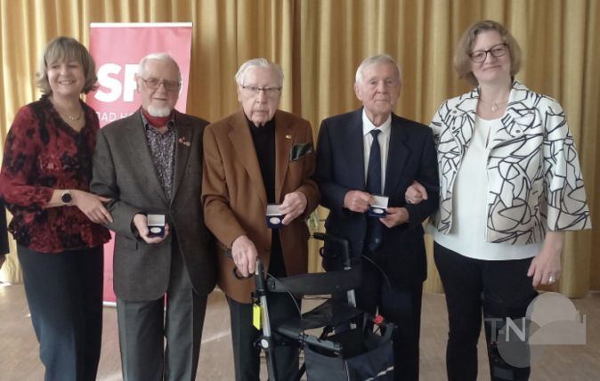 Die Parteivorsitzende der Bad Homburger SPD, Elke Barth (l.) und Staatssekretärin Kathrin Hechler (r.) freuen sich Peter Schmidt, Wolfgang Herder und Wolfgang Zimmermann (v. l.) mit der Willy-Brandt-Medaille auszeichnen zu können.Foto: js