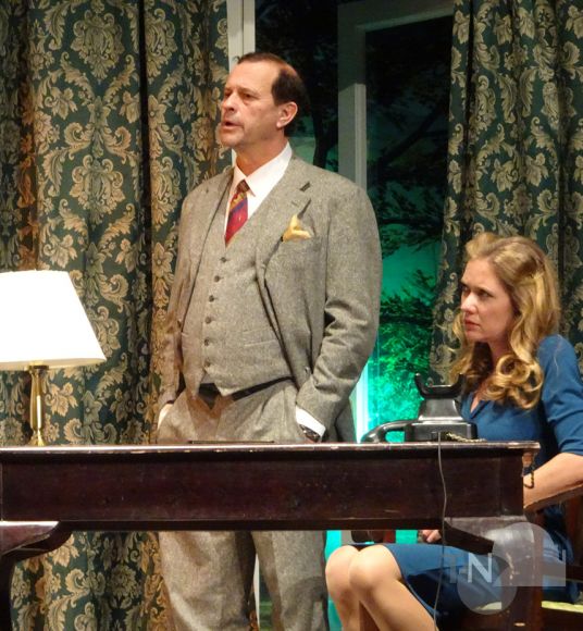 Entsprechend ist auch Sheilas (Yael Hahn) Garderobe, der Stil-Ikone Grace Kelly nachempfunden, von zeitloser Eleganz. Sie durfte noch Nerz tragen. An Shielas Seite konnte ihr Ehemann, der alternde Tennisstar Tony Wendice (Michel Guillaume), gut mithalten. Der möchte seine Frau loswerden, um an ihr Vermögen zu kommen und heckt dazu den perfiden Plan für einen „perfekten Mord“ aus. Tony ist nich zimperlich. Er erpresst seinen alten Freund Captain Lesgate (Christian Buse), der den Mord begehen soll. Sheila hat eine Affäre mit dem Krimi-Autor Max Halliday (Michael Schiller), der in Amerika lebt, von der Tony erst durch einen Brief erfährt. Wunderbar, jetzt kann er Sheila damit anonym erpressen.