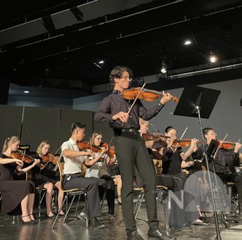 Vollendet wurde der Abend schließlich mit dem Auftritt des großen Orchesters des KFG unter der Leitung von Regina Möller. Zunächst erklang der erste Satz des Klarinettenkonzerts von Johann Stamitz mit dem Solisten Seongwoo Bae und anschließend die Romanze von Max Bruch mit dem Solisten Didier Gonsa (Violine). Eine Adaption der Surf-Rock-Band „The Surfaris“ mit der Solistin Vivien Hoppe am Schlagzeug leitete ein neues Genre auf der Bühne ein. Den Abschluss bildeten die bekannten Klänge aus dem erfolgreichen Piratenfilm „Fluch der Karibik“, die das Publikum zum minutenlangen Klatschen verleitete.