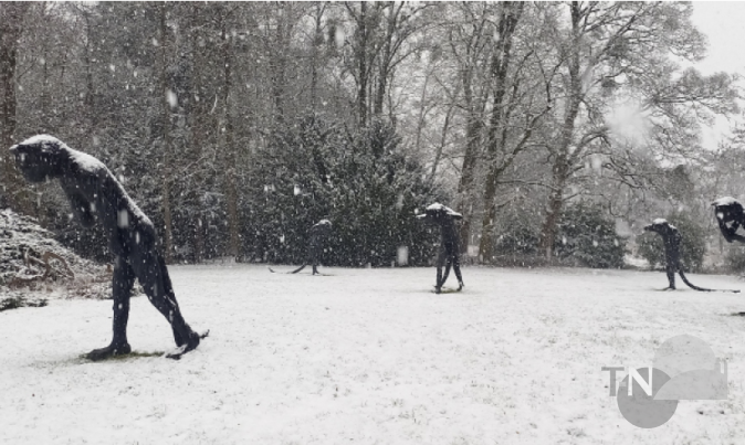 Bad Homburg (js). Für die dicken Schneeflocken, die den Gustavsgarten in eine weiß gewebte Winterwunderlandschaft verwandelten und die Villa Wertheimber umschwebten, hatte Necati Öziri in der vergangenen Woche keinen Blick. Oder auch einfach keinen Platz in seinem Kopf, in seinem schreibenden Ich. Nicht mal für die riesigen „Emissary Cats“ auf zwei Beinen von Laura Ford, Skulpturen im Park, die im Schnee besonders gut zur Geltung kommen. Diese Welt da draußen vor dem Fenster passt nicht zum Tunnelblick, den er braucht, die Figuren für seinen neuen Roman zu entwickeln. Necati Öziri ist derzeit in einer anderen, nicht öffentlichen Welt unterwegs, er arbeitet am Grundstock eines neuen Romans. Hat aber trotzdem Zeit für einen kurzen Besuch von Kulturamtsleiterin Bettina Gentzcke und die lokale Presse.