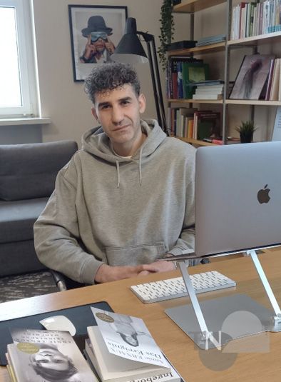 Schriftsteller Necati Öziri hat an seinem Schreibtisch in der Hölderlin-Wohnung Platz genommen.Foto js