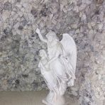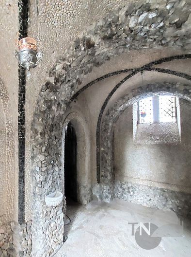 Zwei weitere Öllampen und ein Weihwasserbecken aus weißem Marmor zieren den Eingangsbereich.