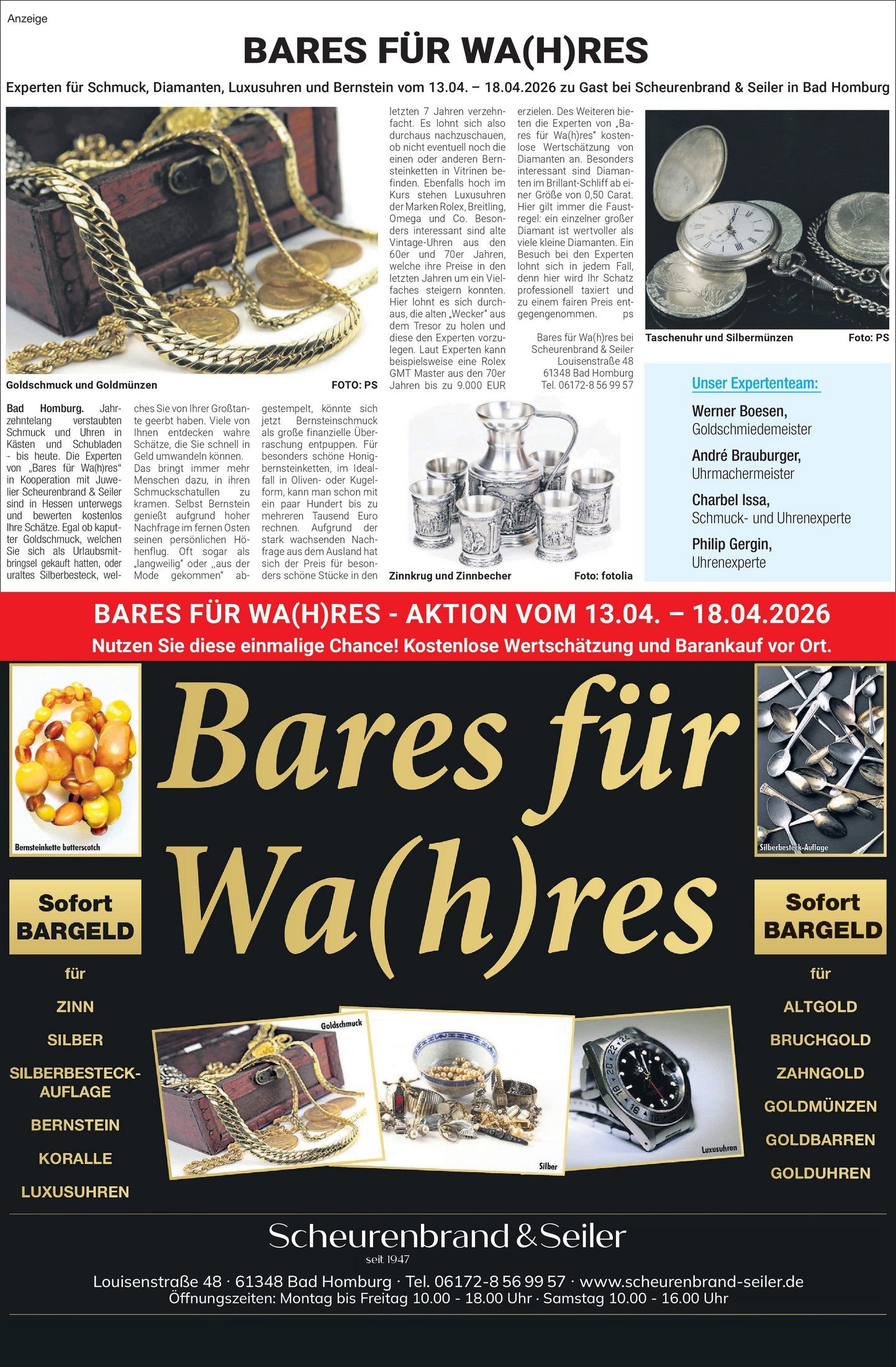 Bad Homburg (hw). In der Nacht von Freitag auf Samstag, 14. Februar, haben Unbekannte bei einem Juwelier auf der Louisenstraße versucht einzusteigen. Die unbekannten Täter versuchten um 3.03 Uhr mit einem Gullideckel die Eingangstür einzuwerfen, jedoch hielt diese stand. Anschließend entfernten sich die Einbrecher in einem unbekannten Fahrzeug. Es entstand ein Sachschaden in Höhe von 500 Euro. Zeugen des Vorfalls werden gebeten sich mit der Polizei in Bad Homburg unter Telefon 06172-1200 in Verbindung zu setzen.