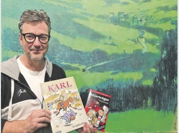 Bad Homburg (bäs). Kurzweilig, facettenreich und inspirierend – der Künstler Michael Apitz nahm das Publikum am vergangenen Donnerstag, 23. Oktober, bei der Vernissage seiner Ausstellung mit dem Titel „Zwei Seelen – die Malerei- und Comicwelten des Michael Apitz“ mit auf eine spannende Reise durch sein über 35-jähriges künstlerisches Schaffen. Die Besucher erlebten die Welt der schnellen, präzise gesetzten Bleistift- und Tuschepinselstriche auf der einen Seite und die mit Acrylfarben flächendeckend aufgetragenen Landschaftsformationen auf der anderen.