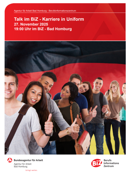 Am 27. November ist es wieder soweit. Im Berufsinformationszentrum der Agentur für Arbeit Bad Homburg findet das diesjährige Talk im BiZ - Karriere in Uniform ab 19 Uhr statt.