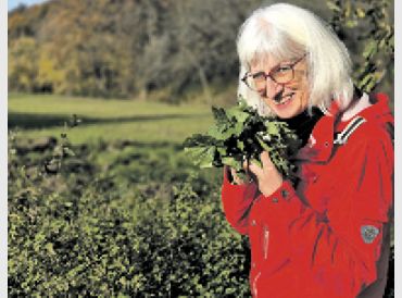 Bad Soden (bs) – An diesem Herbsttag spricht die Natur alle Sinne an: Der Himmel leuchtet blau, die Sonne lässt das Laub in satten Gelb- und Rottönen leuchten, es riecht erdig und die Singvögel sind fast so munter wie im Frühling. Kräuterfachfrau Regine Ebert ist mit ihrem Mischlingsrüden Sammy im Süßen Gründchen am Sauerborn unterwegs. Nicht schwer zu erraten, wonach sie hier sucht: Kräuter!