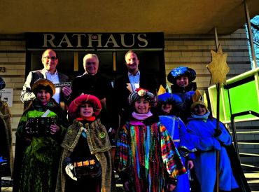 Bad Soden (bs) – Am vergangenen Freitag empfingen Bürgermeister Dr. Frank Blasch (v.l.n.r.), Stadtverordnetenvorsteher Helmut Witt und Erster Stadtrat Dr. Felix Fischer die Sternsinger der Pfarrei Heilig Geist am Taunus vor dem Bad Sodener Rathaus. Sie nahmen den traditionellen Segen „Christus mansionem benedicat“, übersetzt „Christus segne dieses Haus“ von den Sternsingern entgegen.