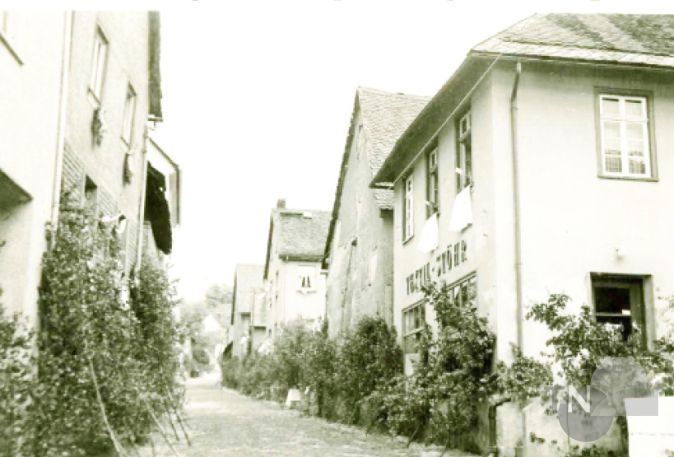 Altenhain (Sc) – Ein Bild aus alten Tagen weckt Erinnerungen: Die schön geschmückten Häuser erinnern an einen Umzug anlässlich eines Vereinsfestes oder vielleicht auch anlässlich einer Prozession. Das Foto aus den 60er Jahren zeigt auf der rechten Seite das Haus Wehner mit dem Geschäft von „Textil Stöhr“ und links die „Middlerst Wertschaft“ zum Taunus. Damals waren die Straßen noch mit Kopfsteinpflaster belegt und eine Rinne diente dem Wasserablauf bei Regen – Fußwege gab es keine.