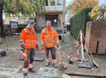Bad Soden (bs) – Starke Regenfälle, der Frost der letzten Winter – und leider auch Fahrzeuge, die unrechtmäßigerweise den Rathausvorplatz zum Wenden nutzen – haben dazu geführt, dass einige der großen Platten vor dem Eingang zum Rathaus zur Stolperfalle wurden.