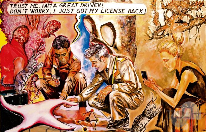 Bad Soden (bs) – Cosmic-Disco-Boys auf Patrouillenflug? Zwei Volksempfänger zur Zeit Napoleons? Lustige Kerlchen mit Sprengstoff? Brennende Posaunen und Trompeten? Und vertikaler Weinanbau im Weltall? Gut ein Dutzend geheimnisvolle Tableaus voller Humor erwartet die Besucher in der außergewöhnlichen Werkschau des Malers Ali Tarlan im KunstKabinett.