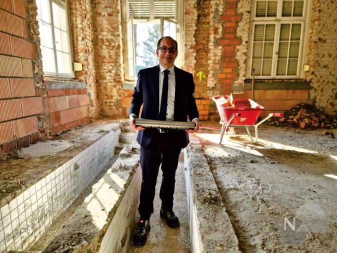 Bad Soden (bs) – Mit dem Einbetonieren einer Zeitkapsel haben die Bauarbeiten im Medico-Palais einen weiteren besonderen Moment erlebt. Im Zuge des Umbaus zum neuen Verwaltungsstandort wurde die Kapsel im Innenbereich des Gebäudes an einem Ort mit eigener Geschichte versenkt: im Bereich eines ehemaligen Kneipp-Tretbeckens.
