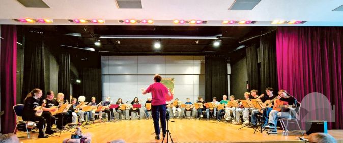 Auf der Bühne saß eine bunte Truppe von elf Mandolinern und zehn Gitarristen verschiedener Altersgruppen, vorwiegend aber der Nachwuchs. Es erklang – noch – mit zartem Klang die Suite in A-Dur von Jens Herwarth (*1938) und ließ Frühlingsgefühle beim Zuhören aufkommen.