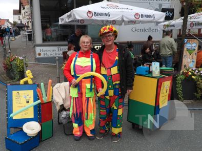 Für den Nachwuchs war es ein ganz besonders schöner Tag. Während sich die Eltern in Strandkörben ausruhten, tobten sich die Kinder auf der großen Hüpfburg aus oder ließen sich die Gesichter bunt bemalen. Auch die Rollrutsche von Chrisus Spielmobil stand bei den Kleinen wieder sehr hoch im Kurs. Maria und Helmut Klinkenberg, alias Klinki und Klinkinchen, sind den Neuenhainern schon bekannt – die beiden Clowns begeisterten Groß und Klein mit ihren Ballontieren. „Bürgermeister Frank Blasch hat das Ballonmodellieren bereits von uns gelernt“, erzählte Helmut Klinkenberg lachend.
