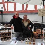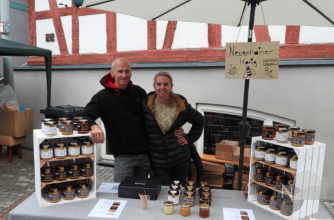 Nicht nur für die Besucher ist der Herbstmarkt ein besonderes Ereignis, für die Neuenhainer Vereine und Kleingewerbe ist es eine einmalige Gelegenheit, auf sich und die echten Neuenhainer Produkte aufmerksam zu machen. Zu diesen besonderen Produkten zählt zweifelsohne der Biohonig „Bee-O“ der Imkerei Burk. Marco und Jessica Burk sind seit acht Jahren Hobbyimker. Ihre Bienenvölker bestäuben die reichhaltigen Obstbaumwiesen rund um Neuenhain. Neben dem hellen Frühjahrshonig haben die Burks einen dunklen, würzigen Sommerhonig im Angebot. „Der dunkle Honig entsteht bei der Bestäubung der Edelkastanien. Er enthält mehr Enzyme und ist mineralienreicher“, so Jessica Burk.
