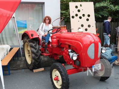 Zu einem Trio hatten sich die Tischlerei Angel, Blumen Weigand und die Oechsle Weinbar zusammengetan. Hier gab es fruchtige Weine und herbstliche Dekoartikel. Wer wollte, durfte beim Baukurs Hammer und Hobel schwingen, was sich der Nachwuchs nicht nehmen ließ. Inmitten des bunten Treibens stand ein historischer Traktor in leuchtendem Rot. Es war nicht der einzige Oldtimer, der auf dem Herbstmarkt ausgestellt war, sowohl ein Trabi des Waschparks Kelkheim als auch der „Kaffeebulli“ vom Backhaus Heislitz fanden ihre Bewunderer.