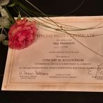 Alle vier Konzertanten wurden von Ulrike Danne-Feldmann am Ende des Konzerts auf die Bühne gebeten, um die Urkunde „Special Prize Certificate“, begleitet von einer wunderschönen Rose, entgegenzunehmen. Nochmals erfolgte ein anhaltender Applaus für die Künstler und Künstlerinnen aus dem voll besetzten Saal.