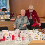 Direkt am Eingang des Raumes lag der Stand zweier Bewohnerinnen des Augustinums. Die 100-jährige Ruth Neumann verkaufte selbst gestrickte Strümpfe und Lesezeichen und wurde von ihrer 90-jährigen Freundin Rosemarie Blechschmidt unterstützt, die liebevoll präparierte Grußkarten mit Weihnachtsmotiven und getrockneten Blüten verkaufte. Der Erlös der Karten ging an die Christliche Hausgemeinschaft Düsseldorf e.V., die seit vielen Jahren Unterstützung für Menschen aus der örtlichen Drogenszene anbietet. Gegenüber gab es verschiedene Lebensmittel aus dem Hofheimer Weltladen sowie selbst gemachte Marmelade und den beliebten Neuenhainer Honig zu kaufen.
