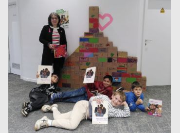 Eschborn (ew). Vier Jungen aus dem Schulkinderhaus Hartmutschule haben am vergangenen Freitag gemeinsam mit ihren Erzieherinnen und Erziehern ihre „Bausteine der Demokratie“ in die Stadtbücherei Eschborn gebracht. Die farbigen Steine entstanden in einem Projekt zu Kinderrechten.