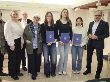 Beim Kunstwettbewerb „Praça dos Pintores“ der Eschborner Partnerstadt Póvoa de Varzim haben Schülerinnen der Heinrich-von-Kleist-Schule vordere Plätze erreicht. Das Motto lautete „Vom Pinsel zum Pixel: Die Farbe der Staatsbürgerschaft in der digitalen Bildung“. In der Kategorie B wurde Isa Lindner Dritte. In der Kategorie A erreichte Paula Bommersheim den ersten und Jini Baek den zweiten Platz. Bürgermeister Adnan Shaikh überreichte den Gewinnerinnen im Museum Urkunden und Preisgelder.Foto: Stadt Eschborn