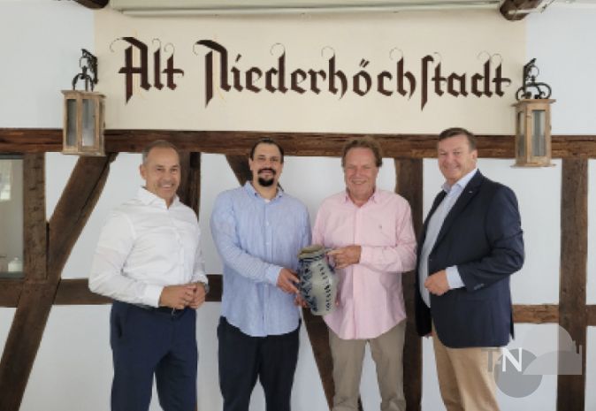 Patrick von Fock (2.v.l.) wird „Apfelwein Müller“ weiter betreiben. Symbolisch übernahm er bei einem Besuch von Bürgermeister Adnan Shaikh (links) den Bembel von Sven (2.v.r.) und Bernhard von Fock (rechts)Foto: Stadt Eschborn