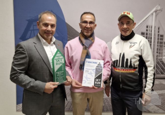 Hassan Kurt (Mitte) ist erneut mit dem Multiclimber-Pokal ausgezeichnet worden. Der Eschborner Taxifahrer und Vorsitzende der „Reverse Runners Eschborn“ absolvierte beim diesjährigen Sky Run im Messeturm eine außergewöhnliche Leistung. Hassan Kurt lief den Turm 20 Mal hinauf. Das entspricht 24.000 Stufen, 1.220 Etagen und 4.260 Höhenmetern. Die Ehrung fand am 16. Dezember statt. Bürgermeister Adnan Shaikh (links) überreichte den Pokal gemeinsam mit Michael Lederer vom „ARQUE e.V.“. Bereits im Vorjahr hatte Hassan Kurt den Multiclimber-Pokal erhalten. Damals bewältigte er den Messeturm elf Mal – allerdings rückwärts. Foto: Stadt Eschborn