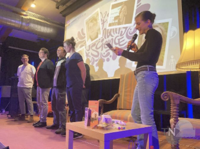 Moderatorin Mathilde Himmelreich (rechts) stellte beim jüngsten „Science Slam“ im „Eschborn K.“ die vier Forschenden vor, die anschließend Kurzvorträge hielten.Foto: te