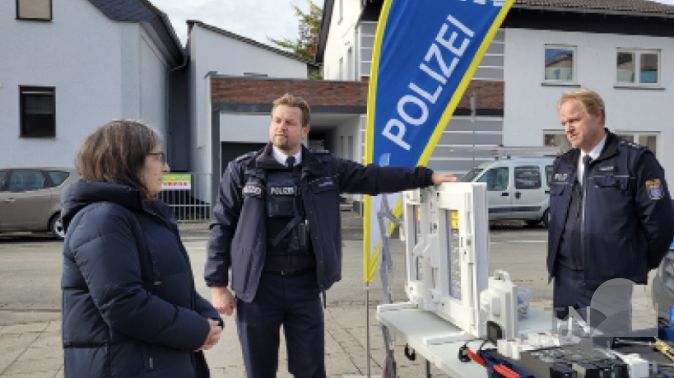 Mit Beginn der dunklen Jahreszeit informierten Präventionsrat, Stadtpolizei, Seniorensicherheitsberaterinnen und -berater sowie Landespolizei am Mittwoch vergangener Woche auf dem Eschborner Wochenmarkt zum Schutz vor Wohnungseinbruch. Der kriminalpolizeiliche Berater Jürgen Seewald (rechts) zeigte Anschauungsmaterial und gab praktische Tipps zur Sicherung von Türen und Fenstern. Als „Schutzmann vor Ort“ stand Polizeihauptkommissar Christian Schneider für Fragen zur Verfügung. Erste Stadträtin Bärbel Grade besuchte den Stand und tauschte sich mit den beiden Polizisten aus.Foto: Stadt Eschborn