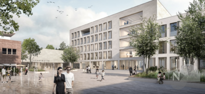 Der Rathausplatz im Jahr 2025 und wie er in sechs Jahren einmal aussehen soll. Hinter dem Bauzaun hat die Entkernung des Rathauses begonnen. Bis mit dem Bau der neuen Gebäude begonnen wird, vergehen aber wohl noch zwei bis drei Jahre.Foto: Schlosser, Grafik: Stadt Eschborn