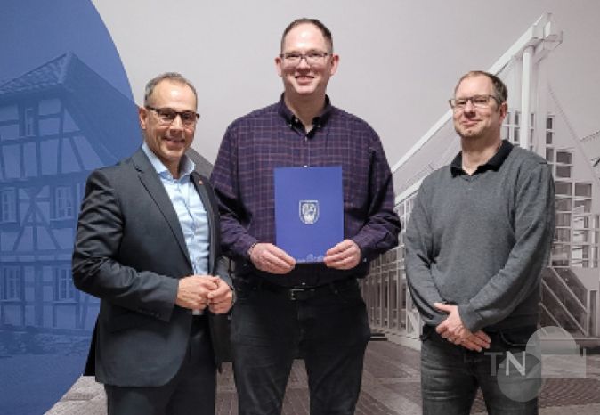Anfang Februar übergab Bürgermeister Adnan Shaikh (links) die Urkunde, mit der Nils Hoffmann (Mitte) zum Leiter für das Sachgebiet Bauverwaltung, Freiraum und Landschaft im Eschborner Rathaus ernannt wurde. Das Sachgebiet ist in den Fachbereich Planen und Bauen eingegliedert, das von Alexander Schilling (rechts) geleitet wird. Nils Hoffmann war bereits zuvor in der Bauverwaltung für die Stadt Eschborn tätig.Foto: Stadt Eschborn
