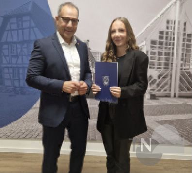 Eschborn (ew). Seit Mitte Oktober ist Sabrina Gay neue Standesbeamtin der Stadt Eschborn. Die 22-Jährige hat in diesem Jahr ihre dreijährige Ausbildung zur Verwaltungsfachangestellten abgeschlossen und wurde nun vorzeitig in das Amt berufen. Normalerweise ist eine sechsmonatige Bewährungszeit vorgesehen. Aufgrund der personellen Situation im Standesamt stimmte die zuständige Aufsichtsbehörde einer Ausnahmegenehmigung zu. Nach Abschluss ihrer Ausbildung arbeitete Sabrina Gay zunächst drei Monate als Sachbearbeiterin im Standesamt und besuchte anschließend ein zweiwöchiges Grundseminar zu Personenstands- und Familienrecht in Bad Salzschlirf. Bürgermeister Adnan Shaikh überreichte ihr im Rathaus die Ernennungsurkunde und gratulierte zu dem frühen Karriereschritt.
