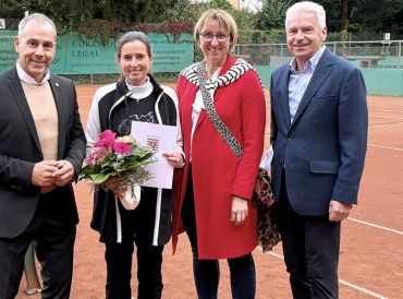 Eschborn (ew). Die Erste Vorsitzende von „Tennis 65 Eschborn“, Barbara Wehner-Krause, hat für ihr langjähriges ehrenamtliches Engagement den Landesehrenbrief erhalten. Landrat Michael Cyriax überreichte die Auszeichnung bei der Feier des Vereins zu dessen 60-jährigen Bestehen.