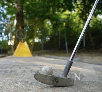 Die 18-Loch-Bahn auf der von Bäumen umsäumten Wiese garantiert Spaß zu zweit und für die ganze Familie, bei Kaffee, kalten Getränken oder einem Eis.