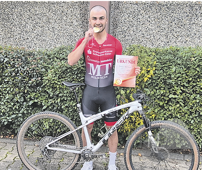 Sie ist echt: Stolz beißt Parham Shahsavari in die bei der Hessenmeisterschaft im XCO-Wettbewerb errungene Goldmedaille und präsentiert die Urkunde.Foto: DRK