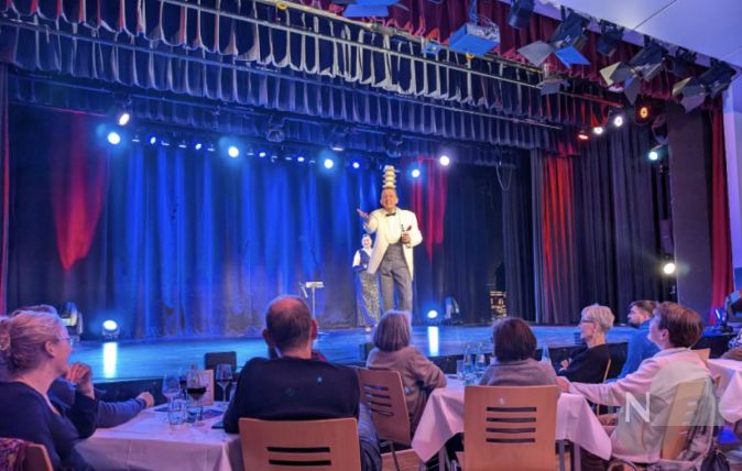 Ute und Leon verpackten ihre Duo-Akrobatik in einer Darbietung voller Humor. Während die zwei Künstler aufeinander Handstände vollführten und Leon seine Partnerin durch die Luft warf und wieder auffing, las der künstlerische Leiter des Viva Varietés, Dieter Becker, die Regieanweisungen laut vor: „Jetzt werden unnötige Figuren eingenommen, um die Beweglichkeit der Künstlerin zu zeigen. Dieser Part ist für das männliche Publikum. Der Künstler versucht dabei im Hintergrund die Choreografie zu überleben.“