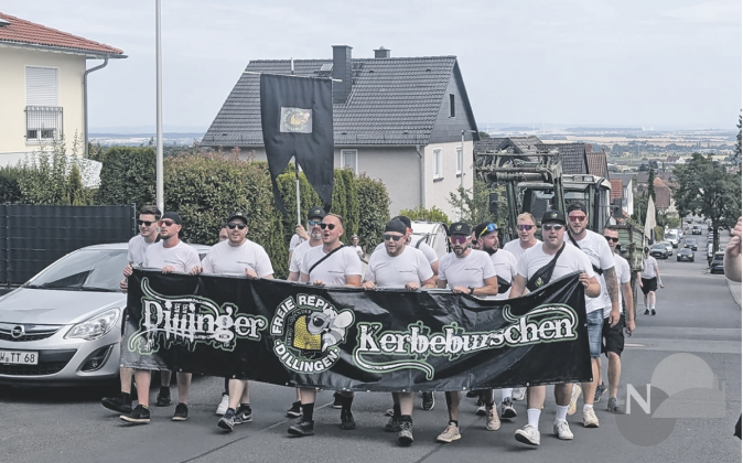 Friedrichsdorf (fw). Am Morgen hatten ihn die Kerbeburschen den Kerbebaum für die Dillinger Kerb aus dem Friedrichsdorfer Wald in der Nähe des Pelagius Platzes geholt, ihn grün-weiß geschmückt und auf einen Anhänger geladen. Damit ging es dann mit Musik, guter Stimmung und gekühltem Apfelwein auf eine Tour durch den Ort, bei der es den einen oder anderen Versorgungs-Stopp gab. Im Anschluss an das Baumstellen luden die Dillinger Kerbebienen die zahlreichen Gäste in den Hof der Familie Halbig an der Kreuzgass‘ ein. Dort erwartete die Besucher ein reichhaltiges Angebot an kalten Getränken, frisch Gegrilltem und eine Auswahl an hausgemachten Salaten. In gemütlicher Atmosphäre wurden sich hier alte Geschichten erzählt, zu neuen Liedern gefeiert und sich auf die beginnende Kerbezeit eingestimmt. Ein weiteres Highlight der Vorkerb war der Wettkampf um den Titel des Dillinger Nagelkönigs. Bei diesem Turnier muss in mehreren Runden jeweils ein langer Nagel mit Präzision in einen Holzklotz geschlagen werden. Am Ende setzte sich der Kerbebursche Janis Hostert gegen seine Kontrahenten durch. Dieser spannende Wettbewerb sorgte für viel Heiterkeit, stimmte die Anwesenden perfekt auf die bevorstehende Kerb ein und weckte die Vorfreude auf die kommenden Festtage in Dillingen.