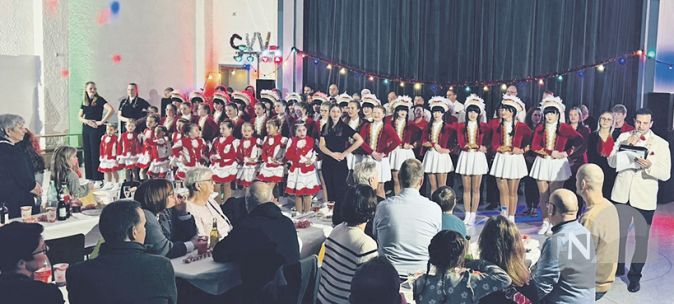 seine jüngsten Tänzerinnen. In diesem Rahmen hob Ponzi auch die Arbeit der Trainerinnen Luis Zehring, Laura-Maria Prota und Sarah Klockmann hervor, denn ohne sie und ihr Engagement wäre kein Auftritt an diesem Abend zustande gekommen. Kurz darauf bat er die Schleiereulen – die unverzichtbaren Helferinnen hinter den Kulissen – auf die Bühne, um ihnen den Kampagnenorden zu verleihen. Mit einem energiegeladenen Auftritt folgten die Rubinfunken, die nicht nur tänzerisch überzeugten, sondern auch erstmals ihre neuen Kostüme präsentierten. Der Jubel im Saal gab ihnen Recht. Sarah Klockmann, die neu in das Trainerteam dazugestoßen ist, und Laura-Maria Prota konnten ihre Freude über einen gelungenen Auftritt nicht verbergen, sie strahlten über beide Ohren.