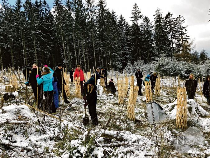Bei prächtigem Winterwetter, die Sonne schien und frisch gefallener Schnee verzauberte die Landschaft, packten trotz Temperaturen um null Grad alle mit an, und binnen weniger Stunden war ein Teil der Fläche bepflanzt, sodass sich hoffentlich ein klimastabiler Mischwald entwickeln kann. Die Förster von Hessen Forst, Forstamt Königstein werden ein Auge darauf haben und freuen sich über zusätzlich von der Natur eingebrachte weitere Mischgehölze.
