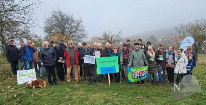 Diesem Aufruf folgten BUND, NABU, IGEL, BI Lebenswertes Schloßborn, Bündnis 90/Die Grünen, die Wählergemeinschaft Schloßborn (WGS), die neugegründete Wählergemeinschaft Oberems (WGO) und viele interessierte Bürgerinnen und Bürger, um sich vor Ort einen Eindruck von der Entwurfsplanung zu verschaffen. Bei nebligem Novemberwett-er war für alle Teilnehmer der drohende Verlust an wertvollem Naturraum unmittelbar erfahrbar, denn die ausgeprägte Hanglage ermöglichte einen guten Überblick.