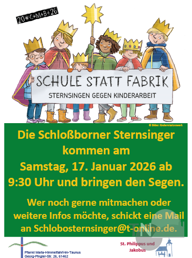 Schloßborn (kw) – Bei der Sternsingeraktion handelt es sich um die weltweit größte Solidaritätsaktion von Kindern für Kinder. In Schloßborn werden die Sternsinger am Samstag, 17. Januar, ab 9.30 Uhr unterwegs sein. Sie wünschen Gottes Segen zum neuen Jahr und schreiben auf Wunsch nach altem Brauch den Segensspruch an die Haustür: 20*C+M+B+26, stehend für „Christus Mansionem Benedicat – Christus segne dieses Haus“.