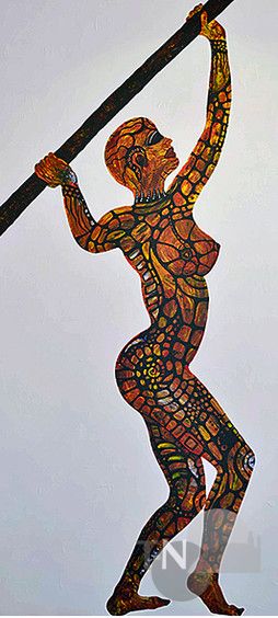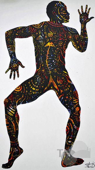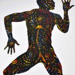 Doch zurück zur künstlerischen Arbeit von Michael Karst, wie sie in einem Begleittext zur Vernissage beschrieben wird: „Ausgehend von einem Fotoshooting, Übertragung der Körper auf die Leinwand und anschließender malerischer Gestaltung der Körper und ihrer Dynamik entstehen faszinierende Bilder, die einerseits völlig archaisch, aus uralten Kulturen stammend wirken und andererseits die zeitgenössischen und sehr jungen Kunstrichtungen wie Bodypainting und Actionpainting vertreten. Wie fast immer in seinen Bildern spielen dabei interkulturelle Zeichen und Symbolik eine große Rolle.