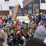 Fischbach (iba) – Petrus hatte sich dieses Jahr eine Auszeit genommen. Konnten die verkleideten Närrinnen und Narrhalesen 2025 noch trockenen Fußes durch die Fischbacher Straßen ziehen, lag dieses Jahr der Fokus auf Regenschirmen, gutem Schuhwerk und wetterfester Kleidung. Ein paar Tage vorher hatte es noch ordentlich geschneit, der Schnee lag größtenteils noch am Straßenrand, beziehungsweise auf den Bordsteinen; nun nieselte es in unregelmäßigen Abständen den eher grauen Himmel herunter. Die Fischbacher ließen sich von dem trüben Wetter die Feierlaune aber nicht vermiesen, bei vielen Kostümen galt das Motto „Ein guter Look geht über Funktionalität!“.