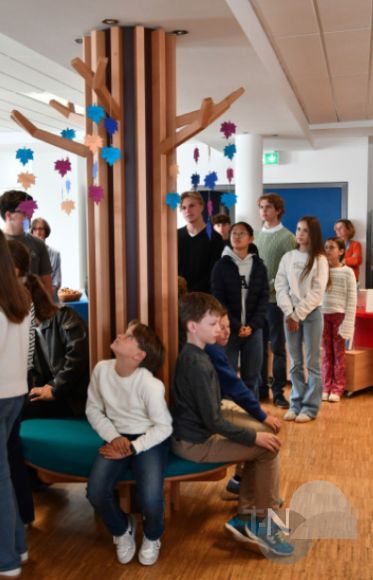 Kunstlehrerin Heike Wölfel und ihre Schülerinnen und Schüler hatten zur Feier des Tages 200 bunte Ahornblätter aus Tonpapier mit Zitaten aus der Welt der Bibliotheken und Bücher gestaltet. Ein Teil dieser kleinen Schmuckstücke zierte die Äste des Baumes, die restlichen Blätter erhielten die Gäste als kleine Erinnerung an die Bibliothekseinweihung