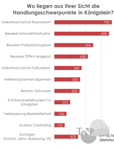 Zwischen März und Juni 2025 konnten Bürgerinnen und Bürger sowie alle Personen, die regelmäßig in Königstein unterwegs sind, online, per Papierfragebogen und bei Veranstaltungen ihre Einschätzungen und Wünsche zur Mobilität in Königstein äußern. Die Umfrage wurde vom Mobilitätsmanagement der Stadt Königstein konzipiert und mit Unterstützung des Verkehrsplanungsbüro plan:mobil ausgewertet. In den kommenden eineinhalb Jahren begleitet das Kasseler Büro gemeinsam mit dem Beteiligungsbüro DialogWerke aus Hamburg den Aufstellungsprozess des Königsteiner Mobilitätsplans.