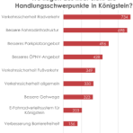 Knapp 1.550 Menschen haben an der ersten Beteiligungsphase zum Mobilitätsplan (SUMP) der Stadt Königstein teilgenommen. Damit wurde eine überdurchschnittlich hohe Beteiligung erreicht. Die Ergebnisse zeigen deutlich: Die Bürgerinnen und Bürger wünschen sich vor allem mehr Sicherheit für den Radverkehr, bessere Radwege und eine kinderfreundliche Infrastruktur.
